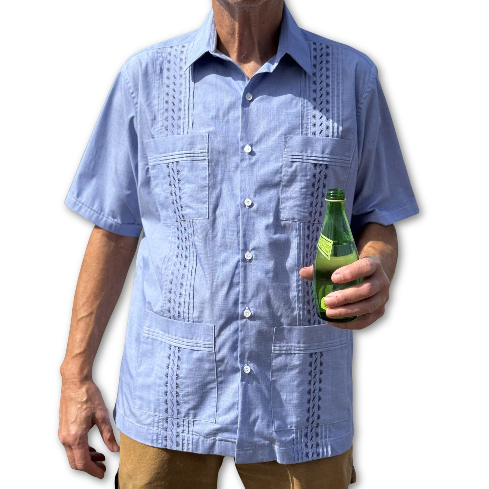 Traditional guayabera details define the shirt. The front panels feature precise pleating with embroidered accents that highlight the craftsmanship of this classic men's guayabera shirt. Four functional pockets and genuine mother-of-pearl buttons complete the timeless look.